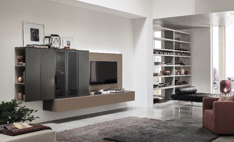 Con Seta, ogni parete del living diventa un angolo di raffinatezza. Finiture laccate opache Terra e Manganese si abbinano al telaio Manganese e al vetro Fumè, per un’eleganza contemporanea fatta di trasparenze e profondità.